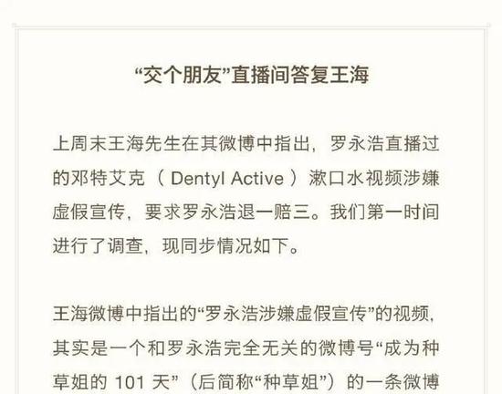 对王海上述质疑,罗永浩“所在朋友”直播间也进行了一一回应,称这段“洗牙视频”是“种草姐”制作或剪辑的,不是罗永浩直播中的内容,已经通过微博私信联系种草姐,要求其删除侵权内容,并保留追究法律责任的权利。