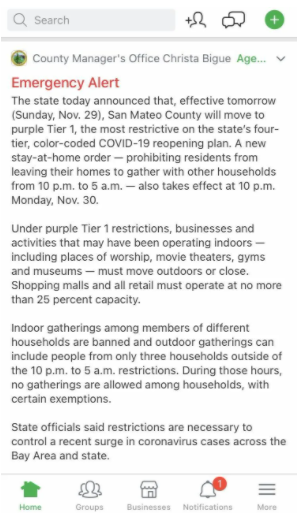 以加州圣马特奥县公共健康卫生部门为例,圣马特奥县升级辖区范围内的健康安全级别到“最紧急”状态(tier 1),该条信息就会自动出现在App的置顶位置。