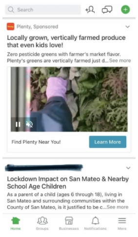 第三种适合大中型企业,比如软银砸下了重金的垂直农场Plenty就在Nextdoor上投放广告,Nextdoor对这类广告主要求,最低一个月广告费用为2万5美金。