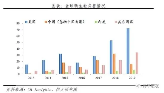数据显示,2019年创投圈融到钱的项目越来越少。根据CVSource投中数据统计,2019年前11个月仅有5387家企业拿到了融资,不足去年的1/2,整体融资规模也在下跌。投资项目减少,独角兽更加稀缺,2019年全球新生独角兽共128家,美国、中国、印度排前三,但我国新生独角兽数量较2018年减少了50%。