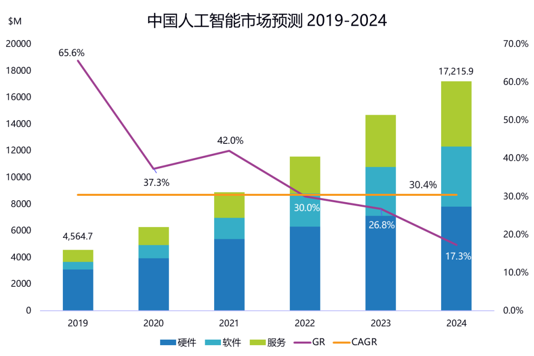 先来看一组数据,2020年,整个中国的人工智能市场规模是63亿美元,据IDC预测,到2024年,这个数字将会达到172.2亿美元。而且,虽然今年受到疫情影响,但中国AI整体市场仍然保持着37%的增长。