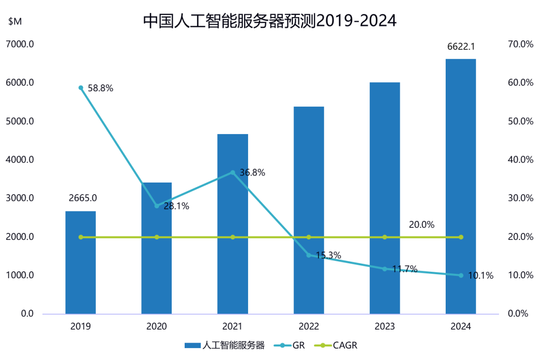 人工智能芯片将继续呈现多样性的发展,GPU依然是数据中心加速的首选,占有95%以上的市场份额;中国人工智能服务器将在未来五年保持高速增长,是整体服务器市场增长的核心驱动力;