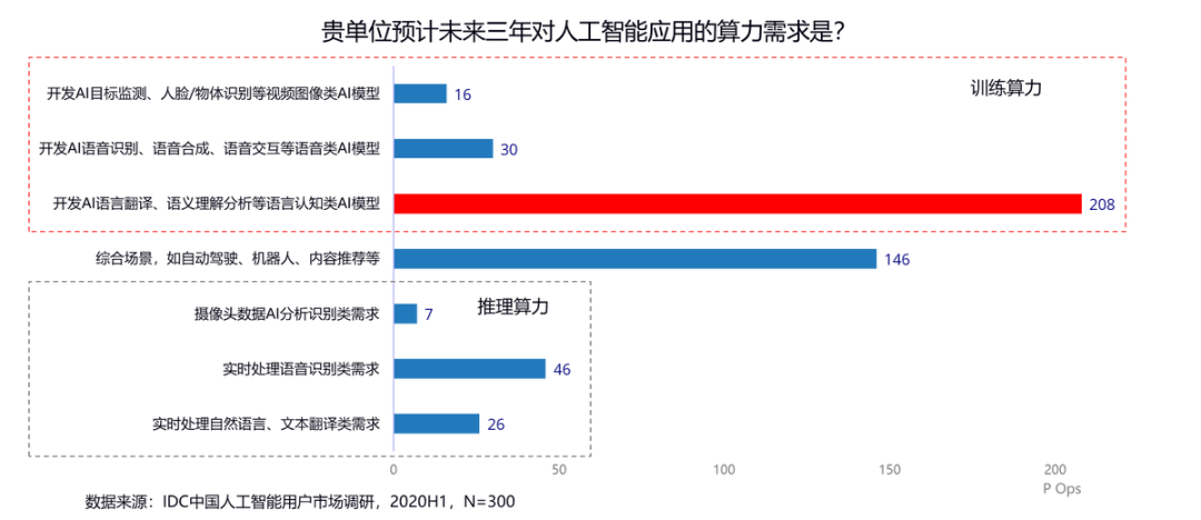 另一方面,IDC认为,未来三年,用户的算力还是集中在两个方面:训练和推理,其中,训练仍然是未来投资的主要方向,并且这个方向已经从纯感知的训练,图像识别,视频识别,语音识别,转向了对语意理解,纯感知到感知以后的推理分析。