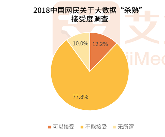 但利润与风险同在,虽然这种方法能够让平台最大程度上获利,但消费者可不会轻易买单。在艾媒咨询发布的《2018中国“大数据杀熟”网民态度行为调查报告》中,77.8%的受访网民会认为服务应用利用大数据进行差异定价的行为不能接受,认为可以接受的受访网民仅占12.2%。