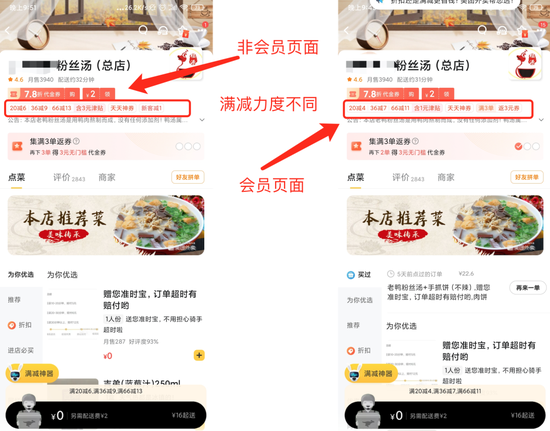 首先是在两个账号进入同一家店铺的页面时,就出现了一个最大的不同——点餐页面最上方的满减力度有所差别。