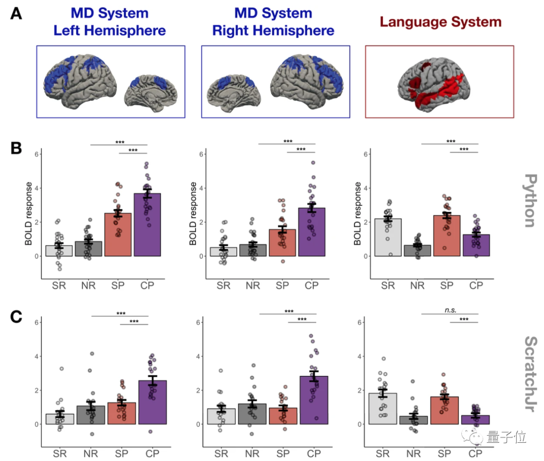 B和C分别展示了在读Python和ScratchJr代码或文本时,通过fMRI扫描得到的响应反馈情况。
