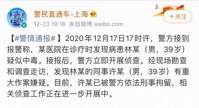 但很快,晚上19时16分,上海市公安局官微发布一则警情通报表示,12月17日,警方接到报警称,医院在诊疗时发现病患林某(男,39岁)疑似中毒。经现场勘查和调查走访,发现林某的同事许某(男,39岁)有重大作案嫌疑。目前,许某已被警方依法刑事拘留。