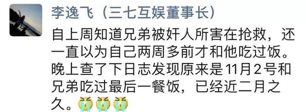 林奇死亡后,关于死因和投毒案的各种推测层出不穷。圈内人士也纷纷发了朋友圈悼念。其中,三七互娱的董事长李逸飞在朋友圈中说到:“自从上周知道兄弟被奸人所害在抢救,还一直以为自己两周多前才和他吃过饭。晚上查了下日志发现原来是11月2号和兄弟吃过最后一餐饭,已经近二月之久。”