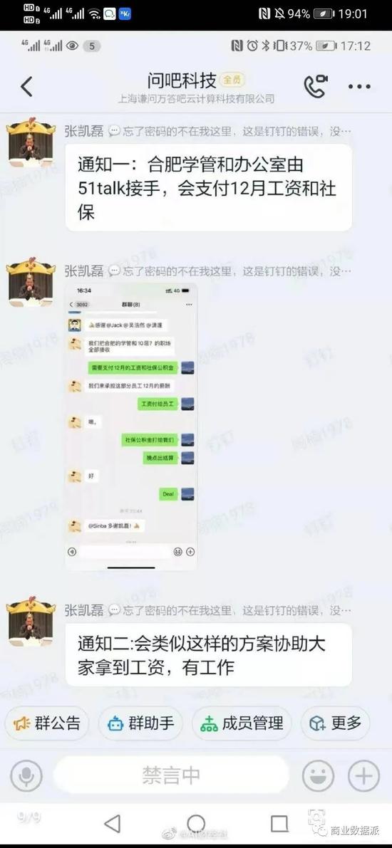 学霸君创始人张凯磊在工作群称:通知一,合肥学管和办公司由51talk公司接受,会支付工资和社保。通知二,会类似这样的方案协助大家拿到工资,有工作。