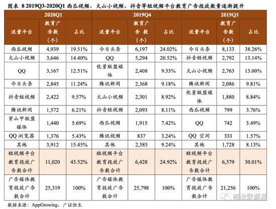 根据 AppGrowing 数据,2019 年抖音在教育领域的广告投放达6429起,市场份额8.96%,火山小视频、西瓜视频占比分别为7.71%、4.97%。2020Q1西瓜视频在教育领域的广告投放达4939起,市场份额达19.51%,同比增长19.46%;火山小视频达3646起,占比14.4%;抖音达2422起,市场份额达9.57%。
