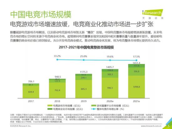 据艾瑞咨询《2020年中国电竞商业化研究报告》,2019年中国电竞市场规模已超过1100亿元,预计2020年将超过1400亿元;2019年中国电竞用户规模约4.7亿人,预计2020年将达到5.2亿人。