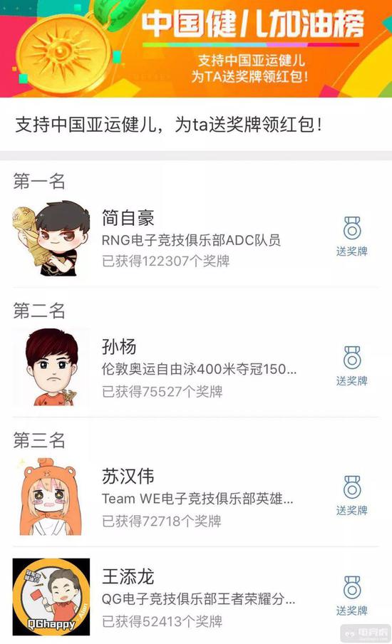 在2018年雅加达亚运会举办期间,新浪微博曾发起“中国健儿加油榜”,在排行榜的前10名中出现了6位电竞选手,英雄联盟项目中的简自豪(Uzi)人气高居第一,超越了所有传统体育项目的巨星,而电竞项目彼时还只是表演赛。