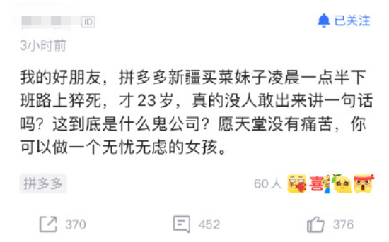 1月3日晚,有脉脉网友在网上爆料,称拼多多旗下多多买菜员工在凌晨一点半下班路上猝死,年仅23岁。这一消息在当晚刷屏朋友圈,但4日一早,这一脉脉爆料贴已无法访问。