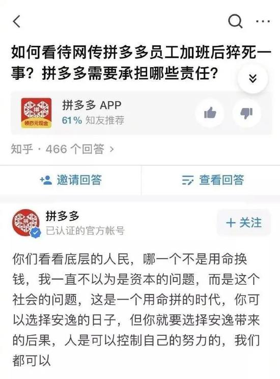 4日中午,网上流传出拼多多在知乎上的一则回复,再次引爆舆论。在知乎话题“如何看待网传拼多多员工加班后猝死一事?拼多多需要承担哪些责任?”话题下,一个拼多多已认证的官方账号回复:“你们看看底层的人民,哪一个不是用命换钱。”这一回复同样很快被删除。