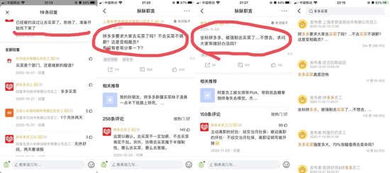 这一番讲话,算是为多多买菜在拼多多的战略地位定调。然而,黄峥不知道的是,另一边在脉脉等平台上,不少认证为拼多多的员工开始吐槽。