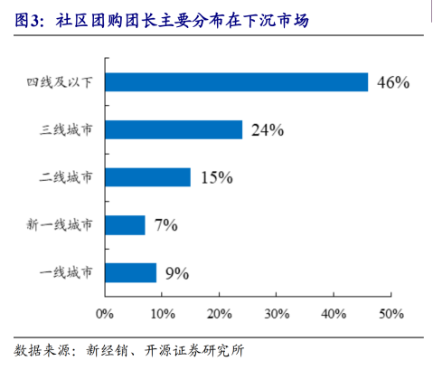 根据新经销数据,目前分布在三四线及以下的团长数量占比达到70%,下沉市场是社区团购的主战场。