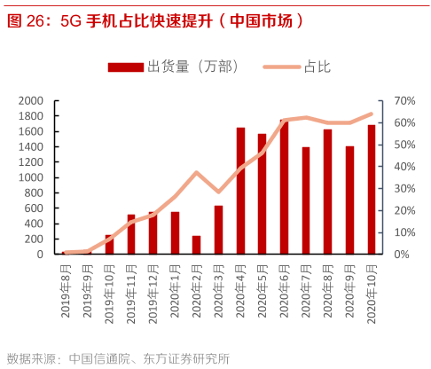 根据中国通信院数据,国内市场5G手机出货量从3月开始恢复上升趋势,而5G手机占比从6月保持强劲势头至今。