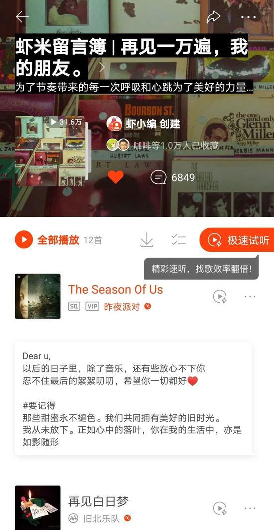 虾米音乐的编辑们,也希望如此。在1月5日的告别公告发出时,虾米音乐编辑部也向往常一样,发出了编辑策划的歌单,名为“再见一万遍”,用白皮书乐队的《清河》,告五人乐队的《披星戴月的想你》等12首歌曲一一道别。