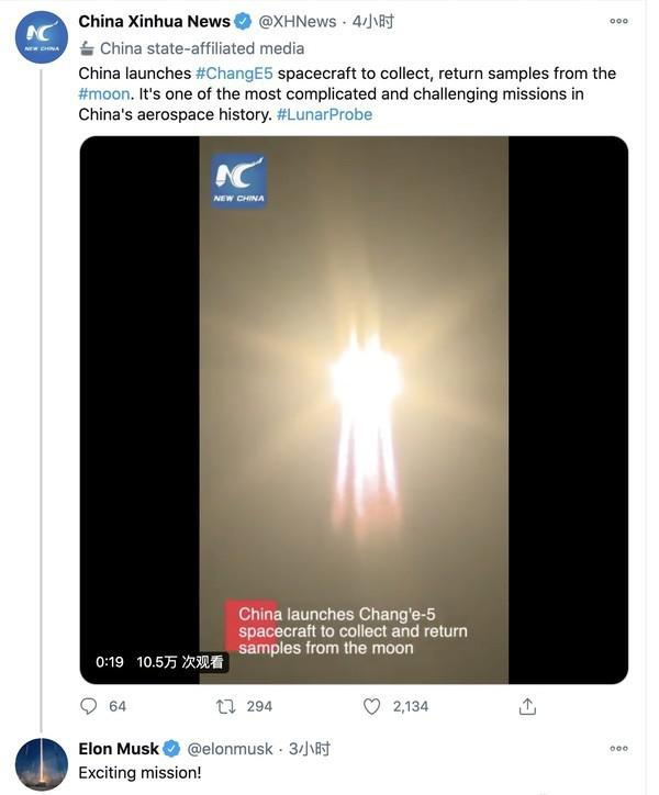 他向来对太空感兴趣。11月24日凌晨4时30分,长征五号在文昌航天发射场成功发射,中国首次地外天体采样返回之旅由此开启。当时,马斯克在推特上点赞了嫦娥五号,称这是一个「令人兴奋的任务」。