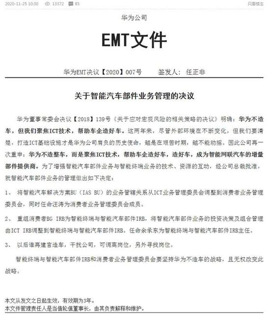 但就在当天下午,华为在心声社区刊出了一份名为《关于智能汽车部件业务管理的决议》的内部文件,文件再度重申:“华为不造整车,而是聚焦ICT技术,帮助车企造车,成为互联网汽车的增量部件供应商”。在文件结尾处还放了一句狠话:“以后谁再建言造车,干扰公司,可调离岗位,另外寻找岗位。”