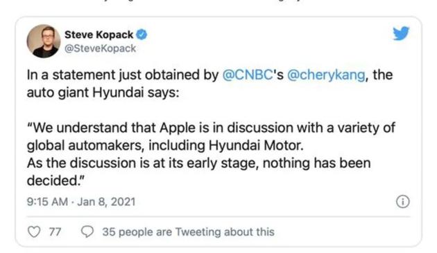 该消息又刺激了现代汽车股价大幅上扬,当天盘中涨幅创1988年以来的新高。然而,现代在之后又更新了说法,声明中没有提到苹果的名字。而苹果则对这方面的消息不予置评。