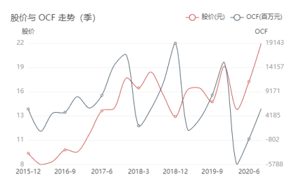 2021年前2周,海尔空调在全国19省市份额超过20%,覆盖区域包括深圳、济南、青岛、沈阳等,相比友商,市场优势已经很大了。其股价的提升也与海尔的OCF(经营现金净流量)的变动高度一致,这既符合逻辑,也没有违背市场的认知。