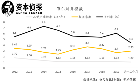 但海尔2020年的财报并不好看。截止2020年Q3,海尔的ROE来到了历史低点。分析后发现,海尔此时无论是总资产周转率、权益乘数还是净利率都处于历史最差水平,就基本面而言此时的它正处于“至暗时刻”。这与股价对比,属实反常。