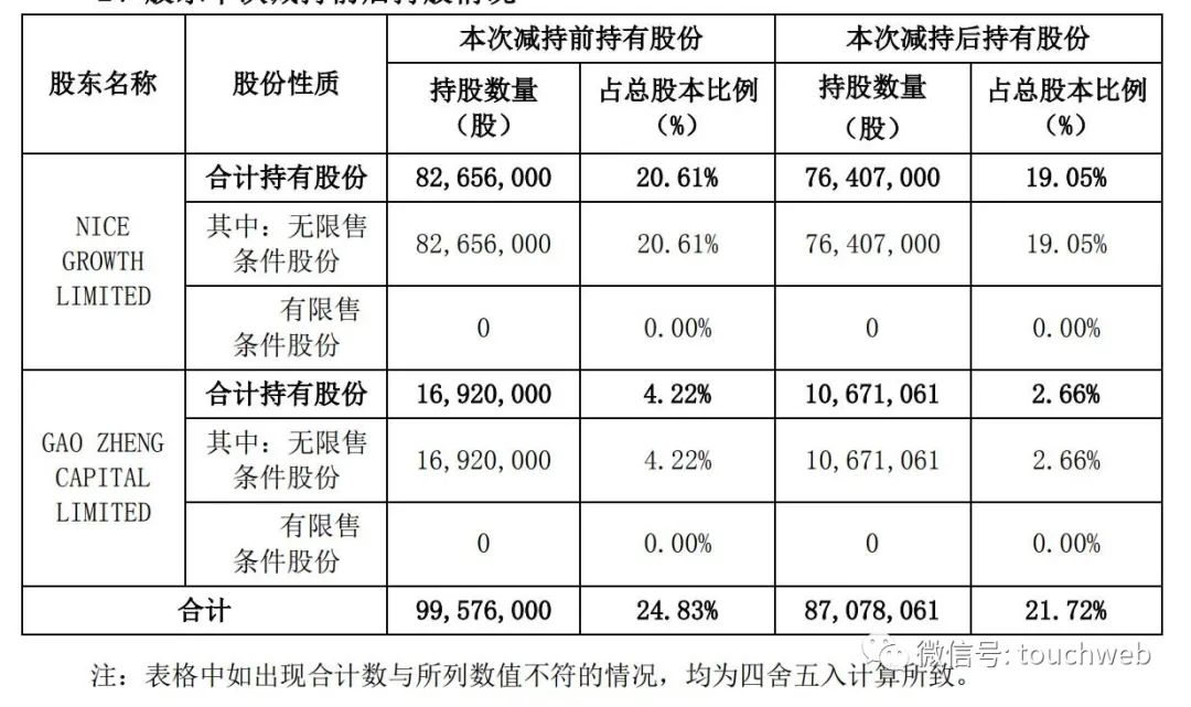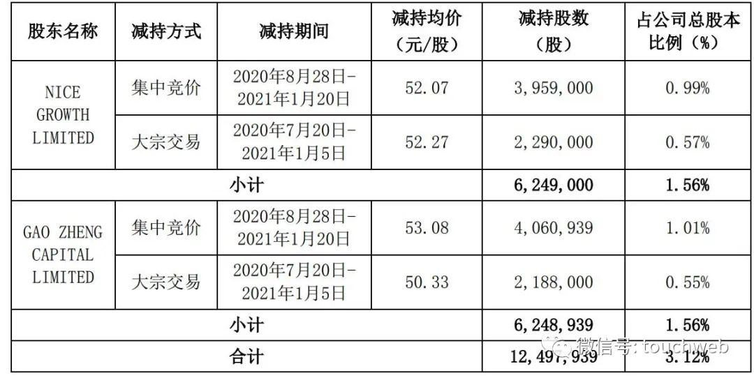 截至2021年1月28日,NICEGROWTHLIMITED及其一致行动人GAOZHENGCAPITALLIMITED已通过集中竞价交易、大宗交易的方式累计减持了公司股份12,497,939股,占公司总股本的3.12%。