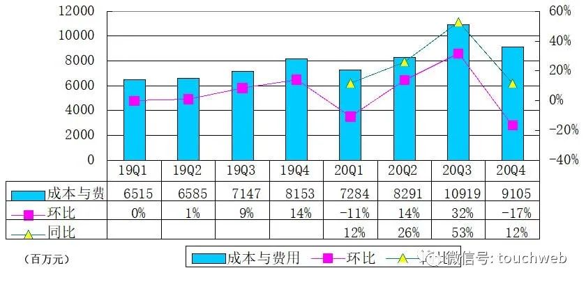 陆金所2020年第四季度成本与费用为91.06亿元,较上年同期的81.53亿元增长11.7%。