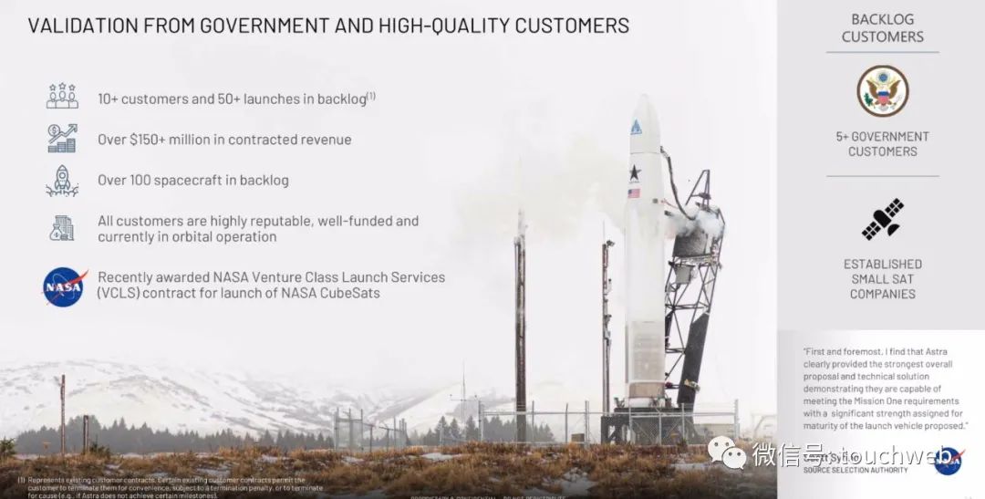 Astra的客户包括NASA和美国国防部等10家企业和政府机构,合同发射收入为1.5亿美元。