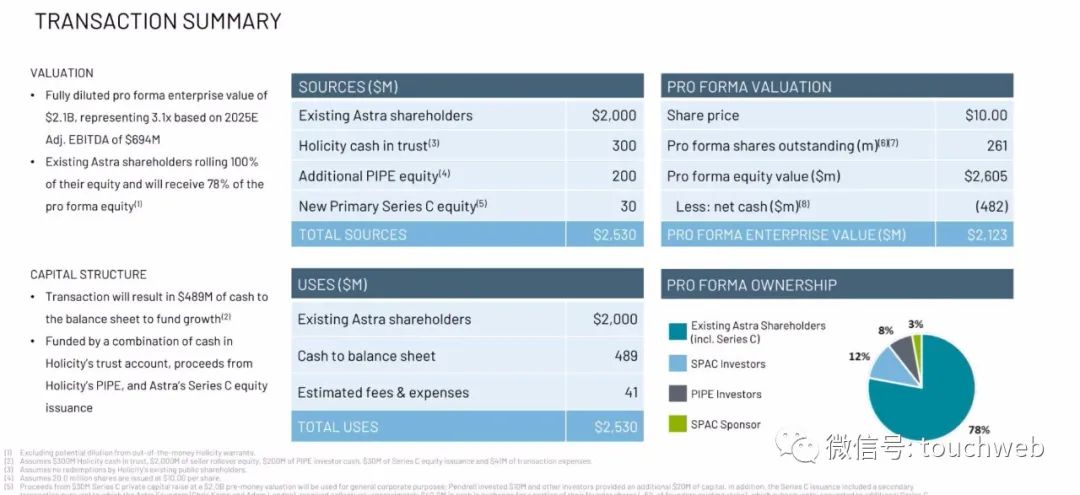 交易完成后,Astra的SPAC投资者持股为12%,现有的Astra股东持股为78%,SPAC Sponsor持股为3%,PIPE投资人持股为8%。