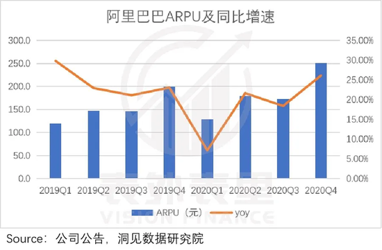 用户在淘宝的停留意愿提升,客观拉动了平台的变现效率。2020Q1,阿里的ARPU增速触底反弹,之后连续三个季度呈现上升趋势。