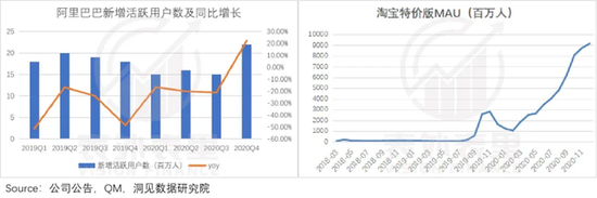 财报数据显示,阿里2020Q4新增活跃用户数,由下降转为上升,同比增速也再次转正;同时,据QM数据,2020年淘宝特价版的MAU增长至近1亿。