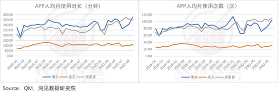 如下图所示,2020年9月淘宝的使用时长重新超过拼多多,使用次数也与拼多多的差距逐渐缩小。