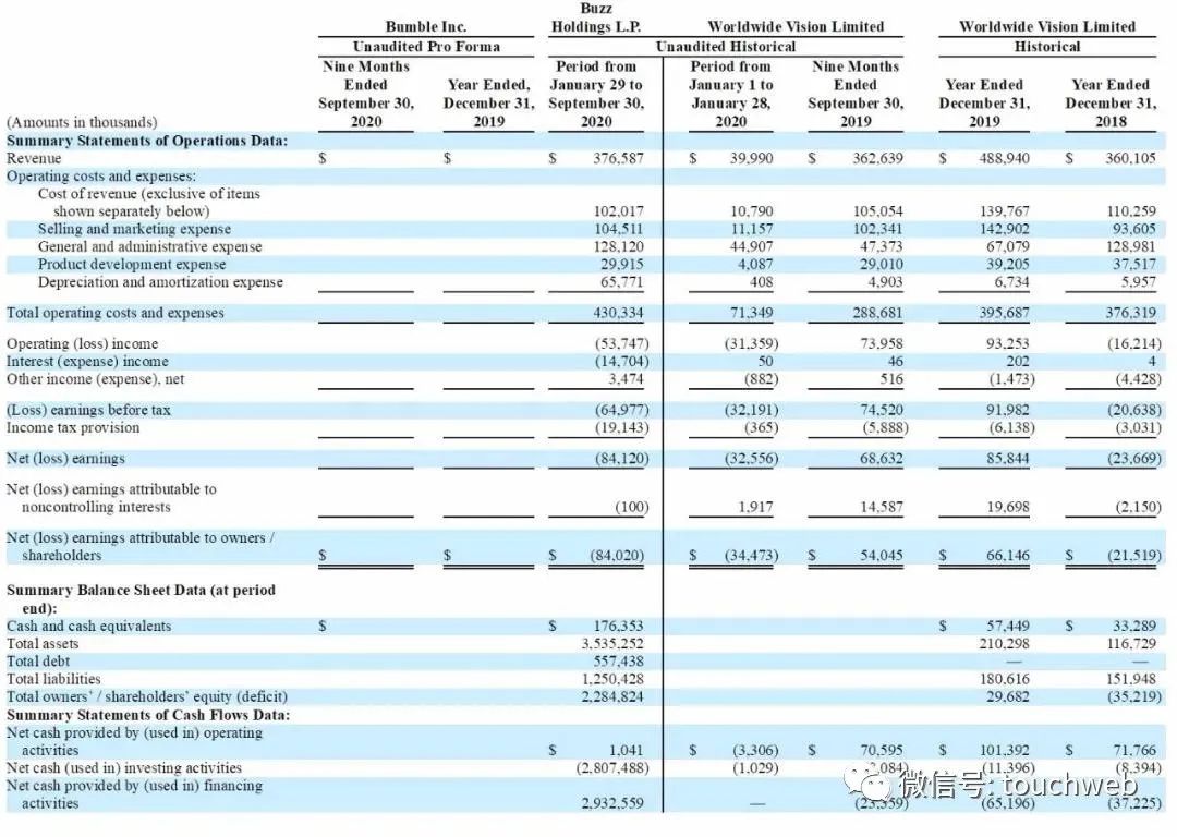 Bumble在2020年前9个月的营收为3.76亿美元,其中,来自Bumble App营收为2.32亿美元,Badoo App及其他的营收为1.45亿美元,净亏损为8410万美元;经调整EBITDA为9890万美元。