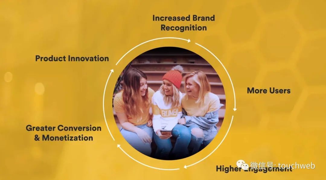 Bumble希望借此鼓励女性跨出第一步,以掌握对话主导权的方式推进两性关系平等,减少平台上的骚扰,让交友环境更安全。因此,Bumble也被称为女版陌陌。
