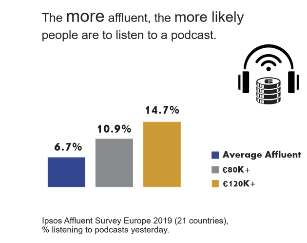 益普索2020年的一则报告则显示,欧洲富裕人口收听播客的可能性几乎是普通大众的两倍:一个人越富裕,他/她收听播客的可能性就越大。