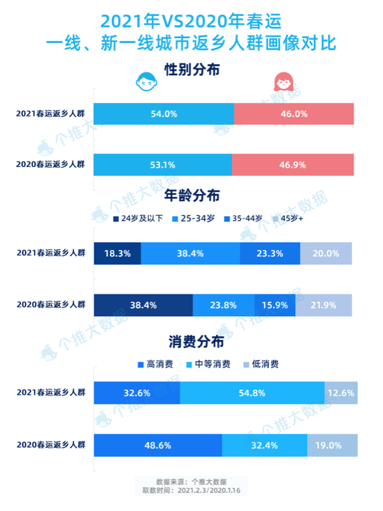 个推大数据持续关注了19个一线、新一线城市这两年的春运返乡人群用户,并根据数据进行了画像。