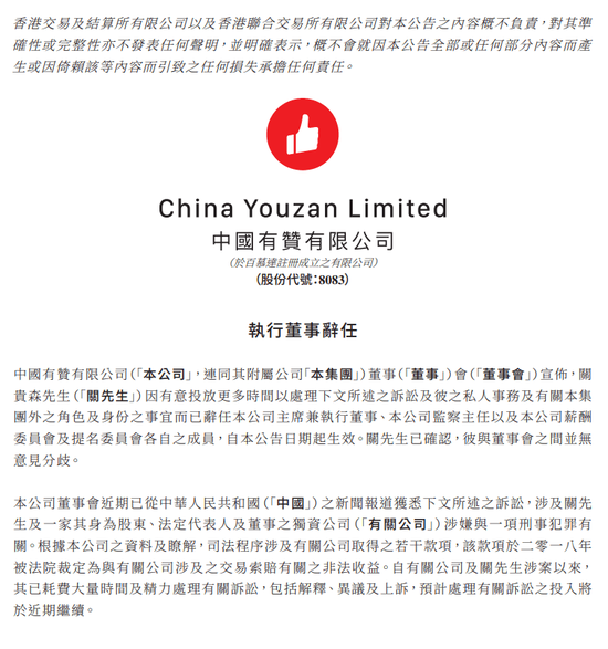 公告称,相关情况及交易发生于超过10年前且在关贵森于2011年2月加入有赞之前;司法程序的涉及事项及有关公司与中国有赞或其活动、业务或人员无关;集团概无其他员工涉及该案件或导致该案件之任何询问或调查;关贵森及此案纯粹以其个人身份,而非与任何本集团或本集团之活动或业务有关。