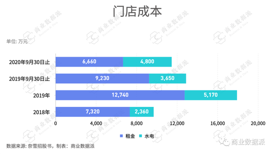 招股书显示,奈雪2018年门店数量为155家,相关的租金、水电费用为9680万元,2019年门店数量为327家,租金、水电费用达到17910万元,同比增长85.02%。可对比同期收益来讲,租金、水电的占比却并不高。