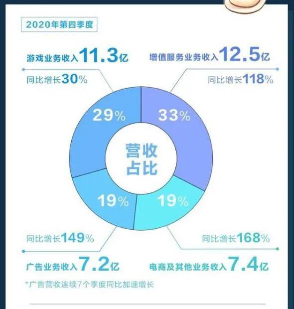 从第四季度具体营收来看,仍是游戏、增值服务、广告和电商四大业务板块。B站游戏业务营收11.297亿元;直播及增值服务营收12.472亿元%;广告营收为7.224亿元;电商及其他业务营收人民币7.408亿元。