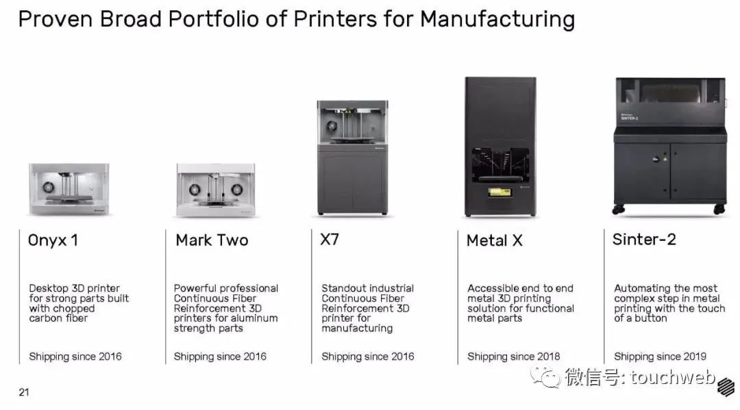 目前,Markforged3D打印机机型包括 Onyx One/Pro、Mark Two、Mark X等等。其中,METAL X、X7、MARK TWO三款具有代表性,它们是金属打印机、工业精度级别的连续炭纤维打印机、连续碳纤维打印机。