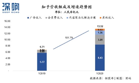 其中占比最多的主要收入来源是广告收入。2020年知乎广告收入为8.43亿元人民币,同比增长46%,占总收入比例达到62.4%。