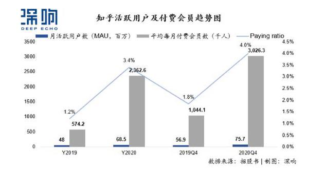 而知乎的平均月付费用户数则为302.6万,同比大幅增长189.8%,用户付费率也从2019年四季度1.8%提升至2020年的4.0%,实现翻倍增长。