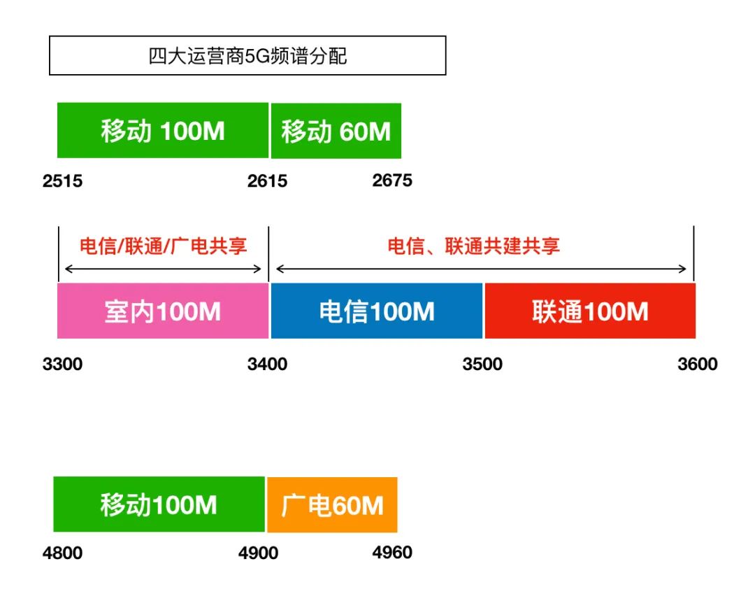 众所周知,根据我国5G频谱分配(如下图),中国电信和中国联通在3.5GHz上分别拥有100MHz带宽的频谱资源,而中国移动在2.6GHz上拥有连续160MHz带宽的频谱资源。目前,三家运营商正依靠3.5GHz和2.6GHz作为主力频段建设5G网络,其中,联通和电信基于3.5GHz频段上连续的200MHz大带宽共建共享5G网络。