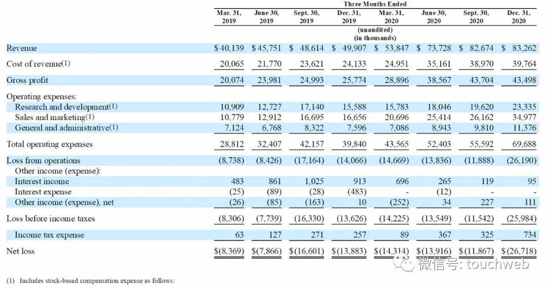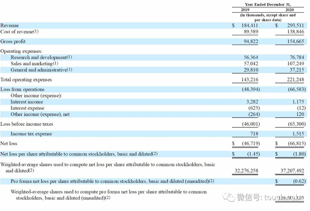 Coursera在2019年、2020年营收分别为1.84亿美元、2.94亿美元;毛利分别为9482万美元、1.55亿美元;运营亏损分别为4839万美元、6658万美元。