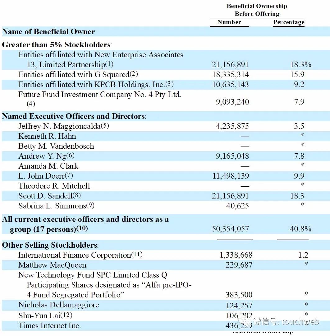 IPO前,New Enterprise Associates 13, Limited Partnership持股为18.3%, G Squared持股为15.9%;KPCB Holdings持股为9.2%;Company No. 4 Pty Ltd.持股为7.9%;