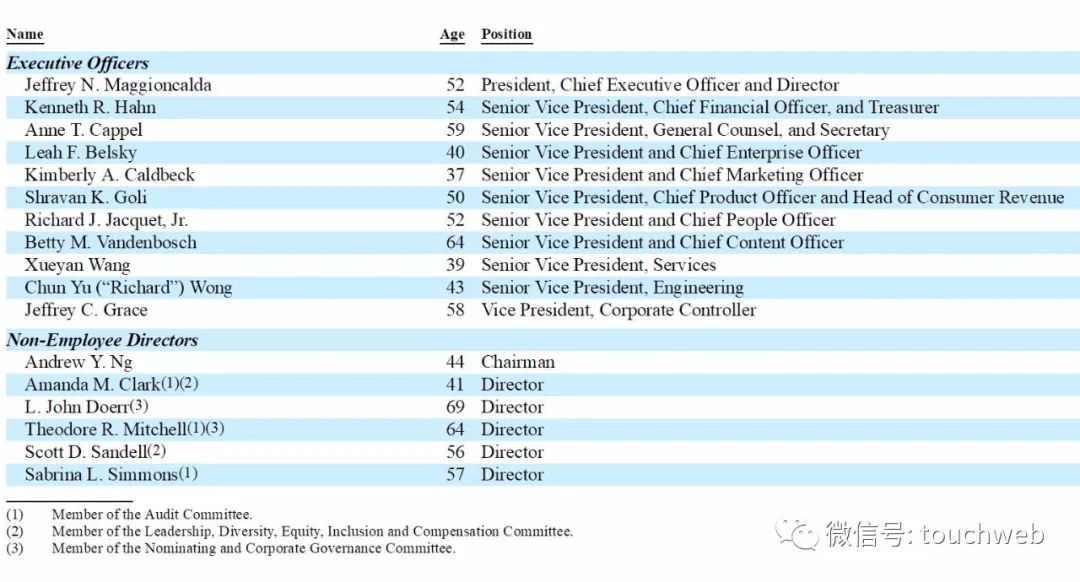 Jeffrey N. Maggioncalda持股为3.5%,Andrew Y. Ng(吴恩达)持股为7.8%,L. John Doerr持股为9.9%。