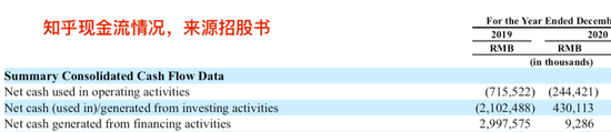 这决定了知乎目前还不能完全依靠业务进账来满足经营投入与资本性开支,需要通过筹资弥补。招股书显示,2019年其融资现金流净流入近30亿元,即主要来自百度与快手联合投资的F轮4.34亿美元,而2020年知乎没有大的筹资行为,融资净现金流进账900多万,主要是处理股票期权所得。截至2020年末,知乎账面上现金及等价物价值9.6亿元,然后就有了这次的IPO。