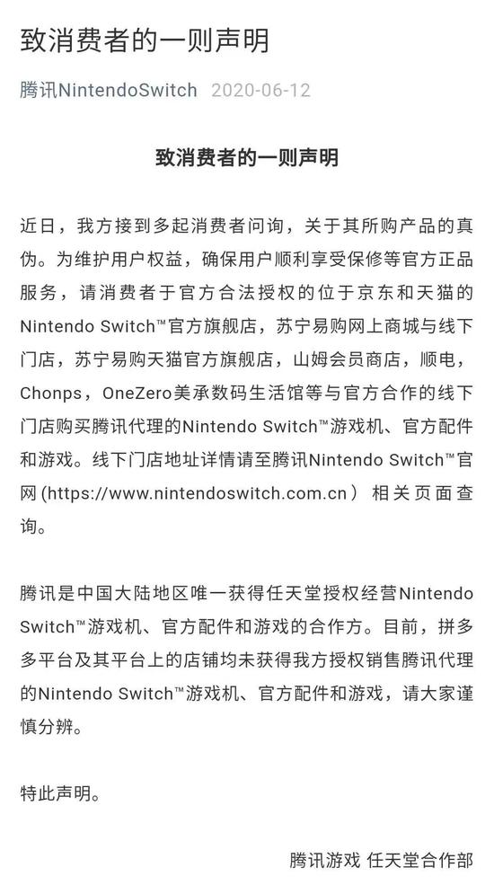 任天堂也曾发布声明称,目前,拼多多平台及其平台上的店铺均未获得我方授权销售腾讯代理的Nintendo Switch游戏机、官方配件和游戏,请大家谨慎分辨。